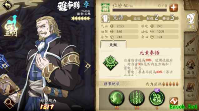 对比英灵:「绝」解臾 气血:甲;物攻:乙;物防:甲;法攻:丁;法防:丁;会心:丁 推荐理由: 1、不输「绝」品质英灵的基础面板评级,相同情况下,基础面板可能比解臾低了10~15%左右,但比起「极」品质的英灵完全不差。 2、实用绝学「反震」:「被动」遭受近战攻击「对战后」对敌人造成1次「固定伤害」(物防的100%)。「反震」在前期的一些实战中的补刀效果真的非常好。 注意事项: 1、对输出不要有所期待,才会有补刀的惊喜。 2、及时提高基础面板,并且注意克制,被秒了就什么都没了。 3. 雅布斯: