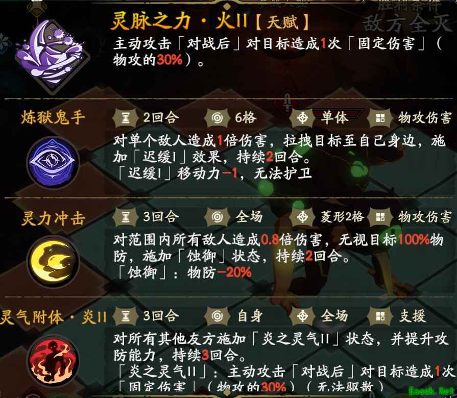灵脉之力·炎:考验坦克的生存能力,高气血的坦克能有效对抗此能力 炼狱鬼手:BOSS的特色技能,能够超长距离拉拽目标,并且施加「迟缓I」效果,玩家需要预判技能攻击目标,阻挡被拉的单位 灵气附体·炎:支援技能, BOSS释放该技能后,小怪能力会全面加强,玩家需要通过驱散或者状态反转来对抗 灵力冲击:BOSS在50级开始 拥有的技能,考验玩家角色的生存和走位能力,需要玩家分散走位,并且利用高生存角色来承受灵力冲击。 以上就是《天地劫:幽城再临》炎幽魉技能介绍的全部内容了,更多手游攻略请关注手游网! 本文内容来源于互联网,如有侵权请联系删除。 |