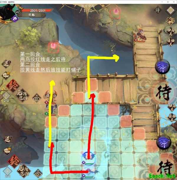 《天地劫:幽城再临》羽魅初级打法攻略一、打法攻略 1、第一回合 两鸟按红线走之后待 2、第二回合 按黄线走然后放技能打蝎子