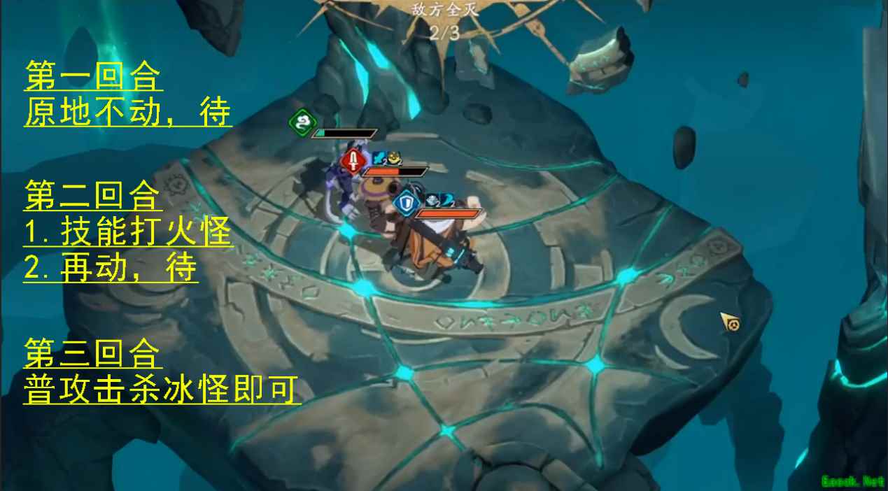 《天地劫:幽城再临》刚破鬼初级通关攻略一、通关方法 1、第一回合 原地不动,待 2、第二回合 技能打火怪 再动,待 3、第三回合 普攻击杀冰怪即可