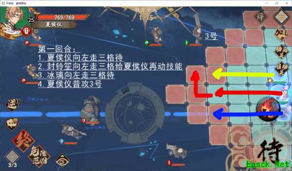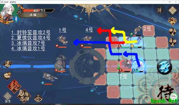 第二回合: 1.封铃笙普攻2号 2.夏侯仪普攻4号 3.冰璃普攻7号 4.冰璃普攻1号