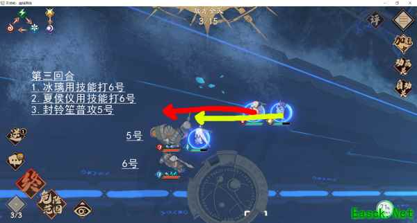 第三回合: 1.冰璃用技能打6号 2.夏侯仪用技能打6号 3.封铃笙普攻5号