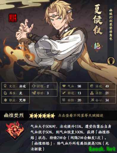 火系最强咒师,拥有强大的火系范围伤害、群体驱散、高额的单体伤害以及极强的保命能力。 拥有幽城主角战阵。夏侯仪就是最好用的火系输出,可近可远。 在面对最难的雷创不仅输出惊人还能提供增伤、降防。 冰璃、夏侯仪、慕容璇玑组成的主角队几乎能够应对所有副本。 推荐魂石:妖术师>朱焰魔火>九环朱蝮=百眼翼魔 推荐词条 法伤=法攻>气血>减伤 推荐路线:推荐拿到焚火真炎后走上路,割裂袍虽然不错但是可以让别人来提供 T0辅助: 封玲笙