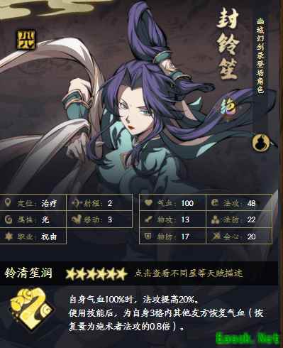 开局最推荐的英灵,只凭借两个特点再行动和奶大稳居开荒英雄榜首。 在面对所有类型副本再行动都具有不可替代的战术意义,除此之外还具有充足的治疗能力。 尤其是在面对高难挑战,充足的奶量保证队伍能够持续战斗。 如果你想选择easy游戏难度,那么请选择封玲笙,如果你想挑战这游戏的极限,请选择封玲笙。 一个抽到能够长久保值的英灵。 推荐魂石:尸魔术士>冥葵 词条推荐 法攻>气血>减伤>双防 冥葵其实还不错,治疗压力不打可以选择 推荐五内:下路 郸阴