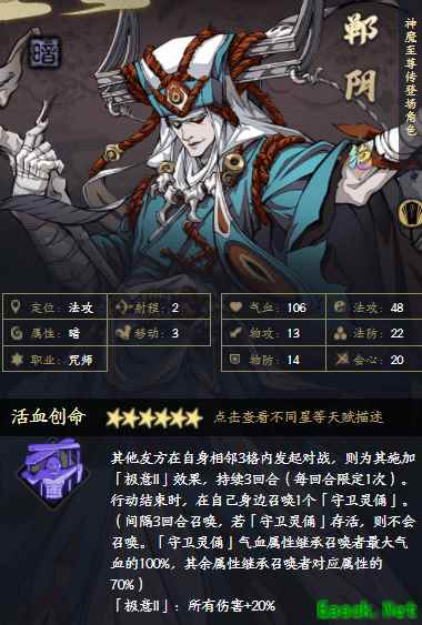 冥皇郸阴是一个改变游戏体验的英灵,越级挑战最好的帮手,毕竟六个人比五个人更能发挥出各种战术,虽然他自身输出能力不强,但是其强大的辅助能力是其他人无法替代的。 其天赋能够为身边所有友军提供增伤,还能召唤出一个具有护卫的灵俑,可以某种程度代替T的功能。 并且能够用来引怪、开团、单吃boss技能等多种能力。 而郸阴本身还能够封魔,禁疗,减魔防,强化队友,甚至免除自身死亡等技能。 推荐魂石:百眼翼魔=鬼面花蛛>九环朱蝮=妖术师 词条推荐 气血>法攻>减伤>双防 推荐五内:走上路,为了PVP推荐拿灵蕴石开全线。