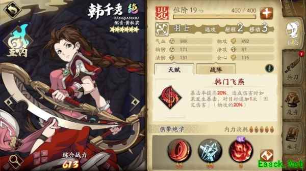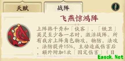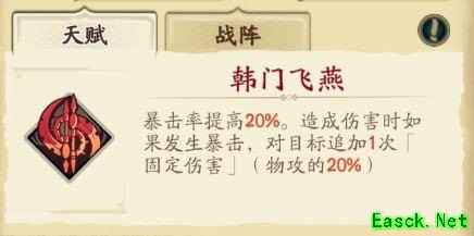 韩千秀这张偏后期的AOE羽士获得了不小的加强。上个版本的韩千秀几乎是最弱战阵,因为只能祝由和咒师二选一。这版本改成三人阵,并且阵法附带了固定伤害,可用性得到有效的提升。 【天赋】韩门飞燕(6星效果截图)