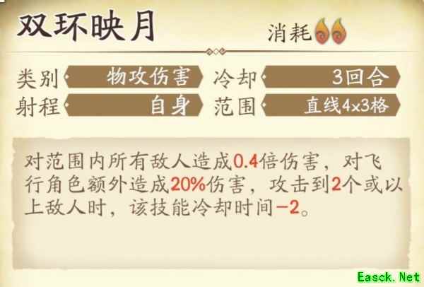 技能搭配1:【双环映月】+【逐风破】+【马踏飞燕】 ※这套技能比较通用,适合一般的非Boss战斗。 ※【双环映月】是全游戏理论CD最短的AOE技能,很容易达成减CD条件,并且配合自身天赋,如果暴击后伤害还不错。 ※【逐风破】这个技能本身伤害一般,但是20%的物理增伤是很可观的。 ※【马踏飞燕】本身效果算不上强,优势在于能够快速刷新其他技能的CD,保证技能释放。