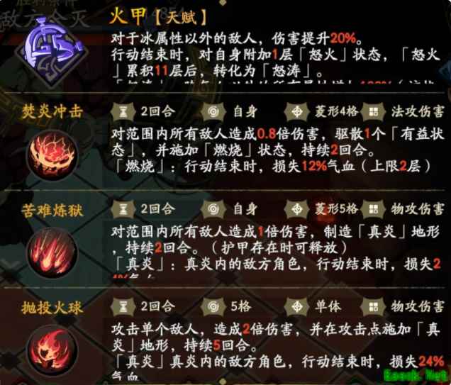 天赋-【火甲】 对于冰属性以外的敌人,伤害提升30%。 行动结束时,对自身附加1层「怒火」状态,「怒火」累积10层后,转化为「怒涛」。 「怒涛」:除气血以外的所有属性增加100%(该状态永久持续) 能力解说:炎系鬼魄尸王拥有限时狂暴能力,不仅考验玩家队伍的站桩输出能力,在清理小怪环节还需要玩家具备边打边走的战斗意识,这样才能为对战BOSS节省一定的回合数。 【普攻】造成物理伤害,0CD,5格射程,单体范围 效果:对单个敌人造成1倍伤害 【抛投火球】造成物攻伤害,2CD,5格射程,单体范围 效果:攻击单个敌人,造成2倍伤害,并在攻击点施加【真炎】地形,持续5回合。 「真炎」真炎内的角色,行动结束时,损失24%气血 能力解说:该技能极度考验单体生存能力,脆皮一定要坦克的护卫之下,而坦克需要优先选用冰系来对抗,同时注意「对战后」留下的【真炎】地形,尽量避免在【真炎】上战斗。 【苦难炼狱】造成物攻伤害,2CD,自身使用,4格范围 效果:对范围内所有敌人造成1.5倍伤害,制造「真炎」地形,持续2回合。(护甲存在时可释放) 「真炎」:行动结束时,损失24%气血 能力解说:超高范围伤害的护甲技能,有预警指示,玩家需要通过击破护甲来打断其释放。如果无法及时击破护甲,可以选择出圈躲避伤害,但是地上余留大范围【真炎】地形,之后的战斗压力会变大许多。 【焚炎冲击】造成法攻伤害,2CD,自身使用,4格范围 效果:对范围内所有敌人造成1倍伤害,驱散2个「有益状态」,并施加「燃烧」状态,持续2回合。 「燃烧」:行动结束时,损失12%气血(上限2层) 能力解说:较高伤害的范围技能,拥有驱散「有益状态」的特性,玩家可以在骗出这个技能后,再释放大量「有益状态」,或者上阵拥有协力技(对战中发挥作用)的角色也能稳定的发挥效能。 推荐阵容 坦克:希维亚