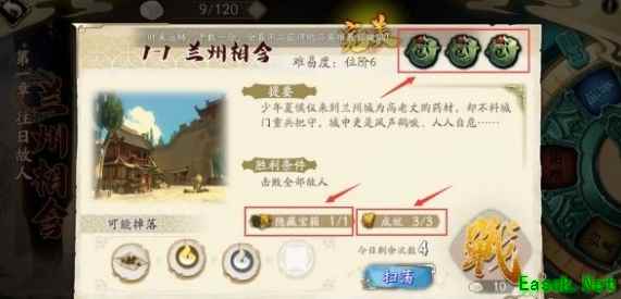 三、【关卡信息】 点击关卡列表中的关卡标题,即可查看关卡的相关详细信息,包括:关卡名称、胜利条件、隐藏宝箱的进度、成就内容、可能掉落的道具、剩余挑战次数、关卡推荐难易度等信息。