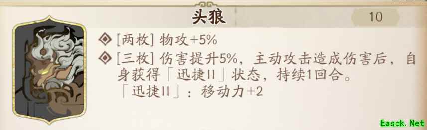 【头狼】:常驻较低增伤,打人就能+2移动力,可以让羽士更灵活。