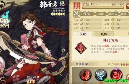 韩千秀肯定是一张偏向于AOE的卡,现在的大部分魂石需要进入对战中就不太适合她 三、五内加点 中路【魔】必点,点出战阵后会有不小的提升。 前期先把下路【魂】的一技能【流火】点了,上路【迅】的以及鞥【吹角】跟【流火】互斥,不推荐携带,为了五内属性可以先点。 之后推荐点出下路【魂】的【挫锐胁迫】。 最后是中路大招【旋刃卷岚】,这个技能其实比较偏向PVP。 考虑自身天赋和定位,上路【迅】的大量会心很必要,如果考虑做主C的话实际上上下两路都得点。