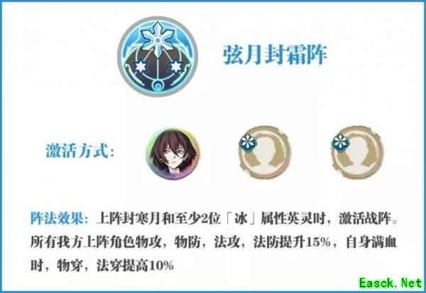 首先【弦月封霜阵】的阵眼封寒月有以下这些特质: 气血高于70%时,法攻会得到一定幅度的提升(3星时提升比例为8%,6星时提升比例为15%) 主动攻击造成伤害后可再移动2格(此效果不随星级提升而发生变化) 大部分技能都带有【迟缓】效果(俗称断腿),不仅能破掉对方的护卫状态,同时也能配合封寒月的天赋形成一种遛狗式的打法(我打的到你,你却打不到我) 因此综上所述,封寒月的能力其实非常特别,在对抗例如火系的灵脉光渊的boss时,几乎可以形成全场的遛狗式吊打场面,同时配合【妖术师】魂石套装的效果来洗技能CD,这种打法已经成为封寒月身上的一项印记。 那么除了阵眼封寒月之外,冰璃也是一位极为重要的冰阵C位,有冰璃和没有冰璃的玩家在玩天地劫的时候根本就是两种体验,同时土豪玩家手中的六星冰璃和封铃笙的组合,如果大家有幸在竞技场里面体验过,那才叫一个惨绝人寰,因此冰璃作为冰阵C位的不二之选,维一对其也不做过多的评析了,毕竟再多的赞美放到冰璃身上都不会多余。 除了冰璃和封寒月之外,【弦月封霜阵】的第三位英灵维一极为推荐的便是太渊隐逸这位英灵,其原因有以下几点: