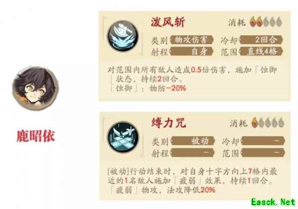 其中选择鹿昭依最大的原因就是上面的这两个技能:【泼风斩】和【缚力咒】。这两个技能一个减防、一个降攻,在针对部分boss的时候这两个效果会有非常重要的战略意义,例如越级打雷系的创命之间副本,雷系boss的超高攻击力可以被【缚力咒】所限制,提升夏侯仪和其他队友的生存力(这个技能最重要是一个被动技能,每回合都可以被动触发一次);另外【泼风斩】带给敌人的两回合减防效果也可以使殷剑平等物理攻击手的输出更为可观,同时也能带动提升回血的效果,此外依依还是一个攻击力不俗的物理坦克,在面对高攻击的雷系boss时也是非常适合的,因此考虑到以上等原因,依依在【天烈炽炎阵】中担任T的效果也是非常突出的。