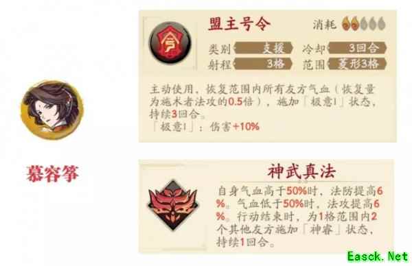 那么【天烈炽炎阵】的阵眼殷剑平的主要能力有: 技能及普通攻击的回血能力非常强大,例如核心攻击技能【日轮神剑】和终极攻击技能【飞星神剑】都有战后回血的特效,同时辅助技能【融会贯通】也是一个可以提供主动攻击后回复气血的技能 殷剑平在满血和血量超过80%时的主动普攻会自动带有【连击】和【追击】的特效,随着殷剑平的星级提升其【连击】、【追击】的伤害也会提升 主动攻击的伤害会有一定幅度的提升,随着殷剑平星级的提升这个幅度也会增加,3星时是10%,6星时是20% 看完殷剑平的特点后我们可以明确的看出,其实殷剑平就是一个类似于自带回血功能的物理攻坚手,自带回血的能力可以使他不那么依赖部分魂石和奶妈的恢复效果,同时也能在攻击敌人时获得超强的持续性,另外主动攻击时加伤害的特点也是非常符合【天烈炽炎阵】所带来的增伤效果。 那么在【天烈炽炎阵】的两位火系英灵的选择上,维一目前比较推荐的有夏侯仪+慕容筝+依依的组合,其中以夏侯仪的效果最为突出,依依和慕容筝可以一起上场,也可以择一选择上场。 至于夏侯仪的首选原因维一就不多说了,考虑到火系法师的数量并不多,因此夏侯仪应该是目前游戏中火系法师上的不二人选。接着我们主要来说下依依和慕容筝的选择原因: