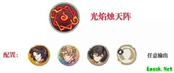 因此如果你在攻略雷系敌人为主的副本,采用【天烈炽炎阵】的阵容搭配维一相信你一定会取得事半功倍的效果! 那么很多玩家也会讲,我没有殷剑平那该怎么办呢?这是我们就得祭出炎系的次位阵法【光焰烛天阵】了: