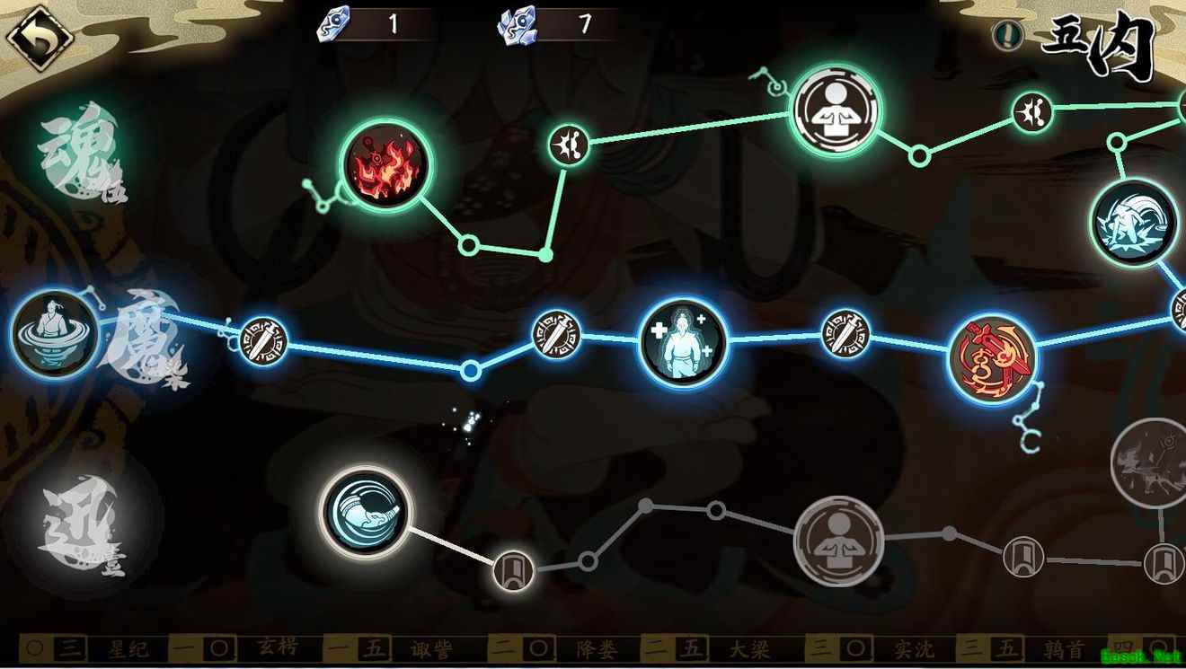 【无方飞剑】+【融会贯通】+【移形】 【融会贯通】让殷剑平第一回合待机后移动力变4格,加上无方飞剑攻击距离2格,可以让殷剑平达到走4打2的6格攻击范围,大幅强化了攻击威胁范围,亦可以PVP里使用。因为【融会贯通】被动包含战后回血续航,魂石就可以不选择【幽魉】,可以选择三枚效果有攻击增伤加成,增加殷剑平一击秒人能力的其它魂石。 四、五内加点路线 主点中路【魔】,副点上路【魂】,后期有富裕可以再点下路【迅】