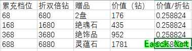 出货顺序: 350钻 铜钱+瓶子+随机极饰品+魂砾,前两者价值略高于0,随机极饰品则是越往后越不值钱,暂定为等价1抽;勉强有价值的是魂砾,价值势必小于350钻。 1550钻 650档全部+绝魂石+泫露+40皮肤券,在这几样中,幸运大奖为皮肤券。 在无折扣礼包的情况下,可以粗略认为1皮肤券=1RMB,有双倍的情况下40RMB=400钻,考虑不氪金很难得到皮肤券,所以对非氪金玩家而言,皮肤券实际价值>400钻,姑且double为800钻。 至于泫露,3000个泫露能换1个绝饰品,平常分解绝饰品是600露,所以奖励中的360个能折0.6个绝饰品,考虑368档累充赠送的是绝饰品,假设各档赠品价值/折钻比例一致,则可以暂且将绝饰品定价在435钻,因此泫露价值=952*0.6=571钻。 同理,绝魂石价值为435钻,则30个魂砾价值217.5钻 当然!这只是理论价值,由于魂石和饰品均存在随机性,因此开出辣鸡=价值为0,只能说期望值大概在这个水平。