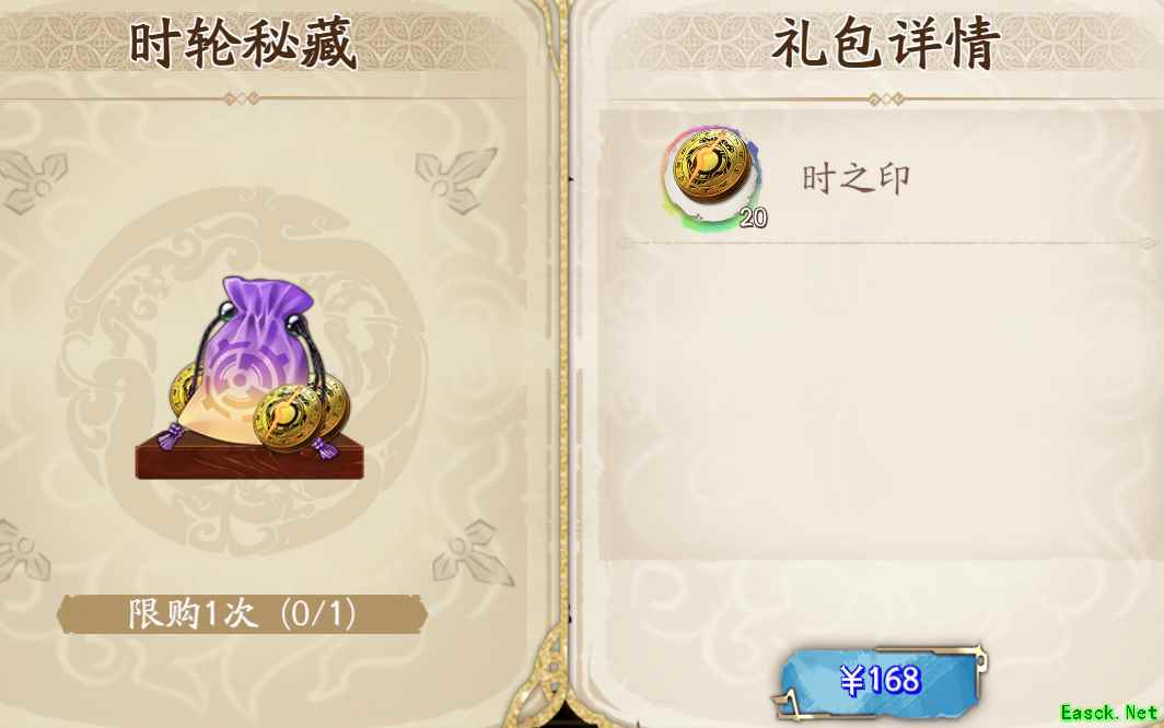 《天地劫:幽城再临》时轮密藏购买攻略用168元购买:20时之印(352) 价格:168元 价值:352元 折扣:四八折(52%off)