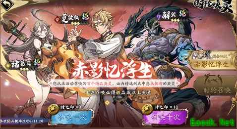 《天地劫:幽城再临》赤影忆浮生活动介绍千煌漫浮生,成影忆三人。同是零J客,蹉跌惹尘纷。其中一人面若桃花,目有黠色; -人俊骨英才, 少年模样; -人龙首虬须, 身姿雄壮。他们逆受世之凉薄,报以恣意颜色,以本真之心踏平前路坎坷。 开启时间: 11月3日10:00-11月17日04:59 限时精选赤影忆浮生开启, 您从本活动中召唤的首个绝品英灵,必为诸葛艾&夏侯仪&解臾三名绝品英灵中您尚未获得的英灵。