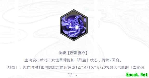 技能【烈蛊糜心】 主动攻击后对非女性目标施加「烈蛊」状态,持续2回合。 「烈蛊」:死亡时对1圈内的友方角色造成12/14/16/18/20%最大气血的「固定伤害」。 以上就是小编整理的关于《天地劫:幽城再临》韩无砂神兵技能介绍的全部内容,更多游戏攻略请持续关注手游网! 本文内容来源于互联网,如有侵权请联系删除。 |