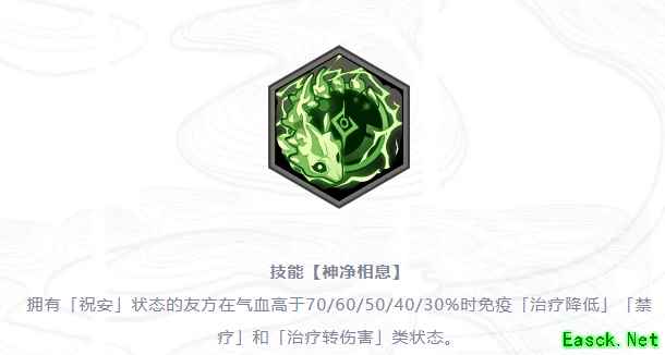 技能【神净相息】 拥有「祝安」状态的友方在气血高于70/60/50/40/30%时免疫「治疗降低」「禁疗」和「治疗转伤害」类状态。 以上就是小编整理的关于《天地劫:幽城再临》葛云衣神兵技能介绍的全部内容,更多游戏攻略请持续关注手游网! 本文内容来源于互联网,如有侵权请联系删除。 |