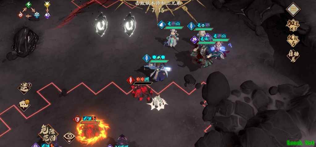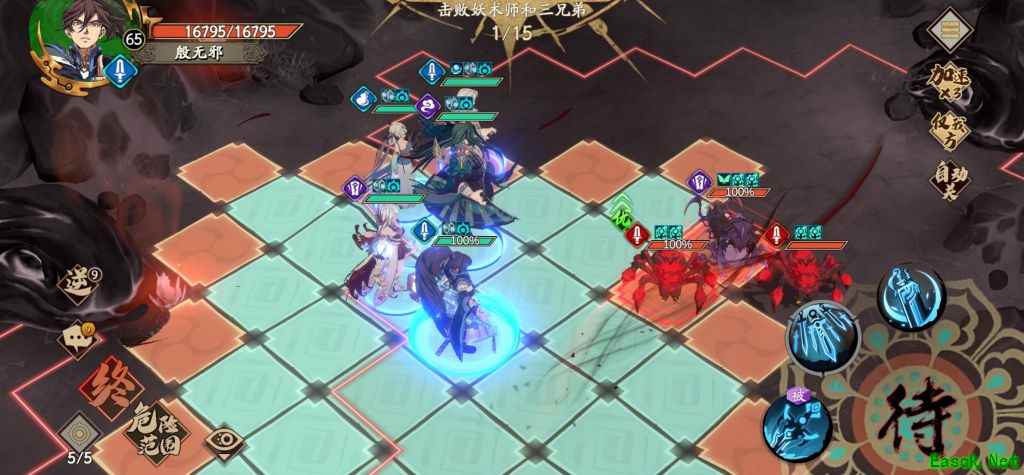 走左下,无邪像这样站过去反蜘蛛,剩下的人原地清怪,黎幽可以开大,这时候大不值钱 第3回合: 无邪开大打蜈蚣,顺便给黎幽做跳板晕蜈蚣,剩下的人上回合运气好应该清光了,运气不好也只剩一只小蜘蛛,不管剩不剩都不要管,冲左边汇合 第4回合: 除无邪外三个输出杀掉蜈蚣,也可能只要一两个人动手就行,但要注意把小雪先凑近,确保能全员吃上加速,没动手的都进传送门,现在靠下的危险区域边缘,无邪带着加速进门,顶上去,站两只蜘蛛的夹角位置,这样正好右边蜈蚣新招的蜘蛛也能同回合反死 第5回合: 黎幽跳晕右边蜈蚣,所有人往蜈蚣身边靠,但是!这回合千万不要打死蜈蚣!即便输出足够,留一层血皮 第6回合:除无邪外所有人待机,留一个输出a死右边蜈蚣最后一下,全员吃到2回合加速,这时候无邪顶上去,站在能够反死靠前的两只蜘蛛的位置 第7回合: 无邪极限距离胡霜千里减速老三和左边的物免老x(忘记了),然后开始小雪刷双免,刷好后,所有人在距离无邪3格的位置落位,无邪这个位置正好可以反死两只新蜘蛛,并且吃右边法免老x一击暗灭弹,还要挨妖术师一个地图炮,如下图示例