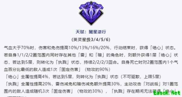《天地劫:幽城再临》魔化皇甫申天赋介绍魔化皇甫申天赋介绍 1、气血大于70%时,伤害和免伤提高10%/13%/16%/20%, 2、每次行动结束可以获得一层绝心效果:全属性提高4%。若达到5层,则转化为「执戮」状态。 3、「执戮」状态:全属性提高20%,雷伤减免和暗伤减免额外提高30%。 4、周围有雷系和暗系角色会加绝心的层数。 5、死亡时可以自爆。 总结:核心为快速叠加绝心效果变为执戮效果,属性提升很多,并且自带的减伤可以站很久,适合搭配雷系或者暗系的法师队。