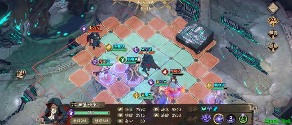 《天地劫幽城再临》江湖玄冥教15通关攻略:玄冥教 不出所料这关猫猫变成了boss,原来是幽篁大人。然后当我被一个有着虚弱加乱神的的他一个全体aoe搞得只剩下t和光系剑圣的时候,我知道常规打法估计挺难了。
