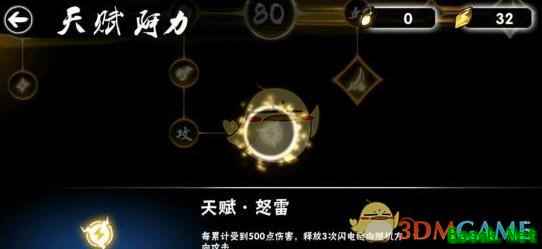 天赋·怒雷 每累计受到500点伤害,释放3次闪电链向随机方向攻击。