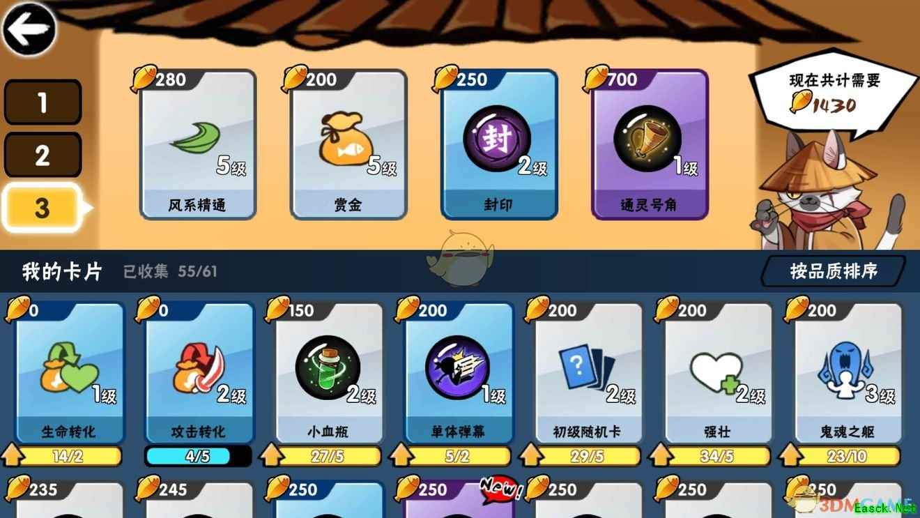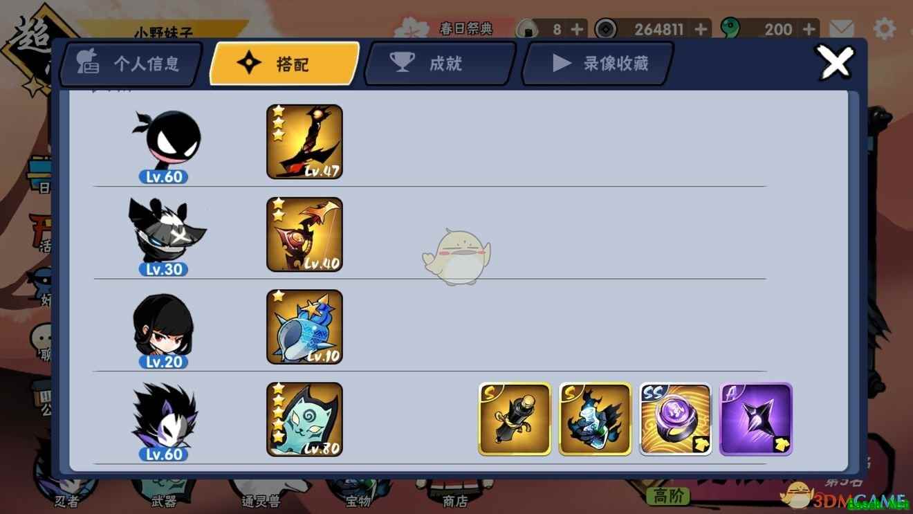 苍牙还没觉醒,武器是80级的风扇,s级的飞镖始终没有,一直用着a级的。 一、宝物选择 属性套装(戒指+镖)一定要带,就算没有ss级的,哪怕带个a级的也好,这个段位大多是精锐图和困难图,稍微熟悉一点就不会有生命危险,而属性套提供的忍术加强和飞镖球加强可是实实在在的。 剩下两件宝物位置,其中一个选择一个带忍宗印法,另一个视情况而定。 带上忍宗会使你在绝大部分情况(甚至是没有吃全金鱼币)在面对boss时都有大招,这对于应对对面的脏牌(诅咒,虚弱,封印,陷阱)时会更有选择释放时机的空间。 最后一件,如果战场效果是死穴或者狂暴这种威胁相对大的选择带魂水,如果是其他的就带一件加攻击的,太鼓和青蛙油都可以,毕竟这个面板在这个段位攻击太低了,能补多少是多少吧。 二、武器选择 挑一把用着顺手的武器,优先升到5星80级左右,毕竟锤子数量有限,再去升级副武器,这样可以补足一点面板上的劣势。 一般每个boss只能使用两次武器技能,像蝙蝠,青面鬼,黑龙,大宝剑都有明显的后退路线,第一次技能一定要留到boss后退时再放,第二次cd好了就放,这样的话基本能打出跟面板2500已觉醒的队友旗鼓相当的输出,我的88场MVP能证明这一点。 三、卡牌选择 这里介绍两种思路,第一种是辅助流,就是全带脏卡,封印,诅咒,虚弱,陷阱,本来面板就低,其实不指望你来打输出,但是脏卡如果放的时机合理就能起到更大的作用。 第二种见下图