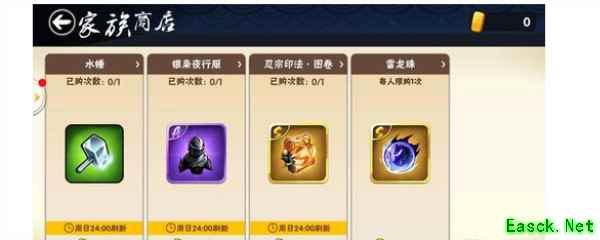 新手玩家需要忍阶达到中忍之后才能开通家族权限。点击家族旁边的商店按钮就能进入到家族商店界面,在商店界面的礼品都是可以进行兑换的,但是兑换的商品物品需要家族任务里面获得。