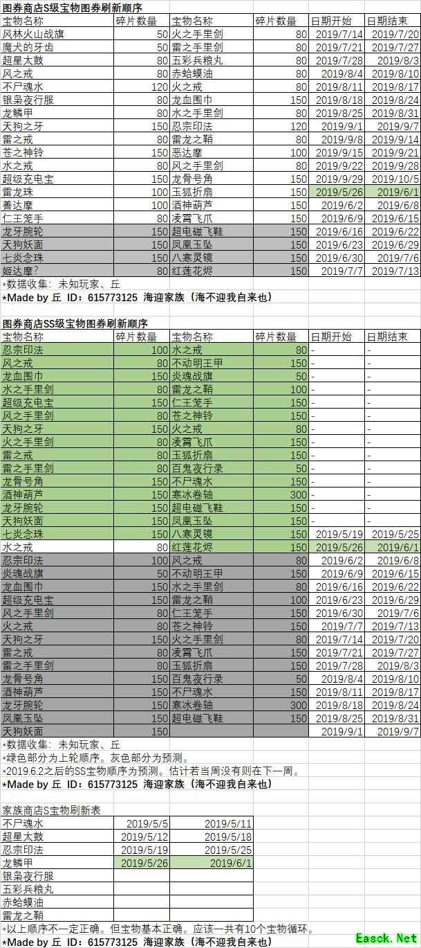 《忍者必须死3》宝物刷新顺序一览表绿色代表当周所在位置。 新角色专属宝物已加入轮换,S宝物仍然是原来的顺序。估计S宝物会类似SS宝物的新增加在一轮结束的末尾。 姬达摩加入时间未知,估计加入之后会影响刷新顺序。