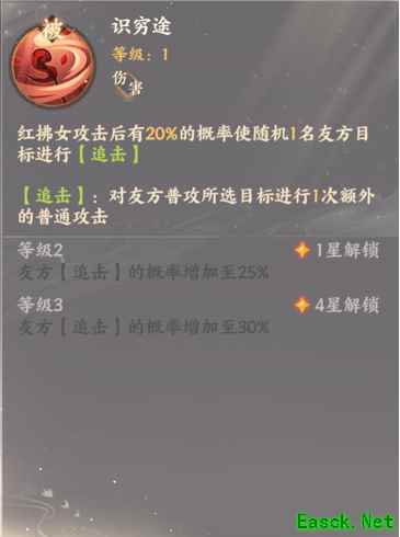 二:识穷途 红拂女攻击后有20%的概率使随机1名友方目标进行[追击] [追击]:对友方普攻所选目标进行1次额外的普通攻击