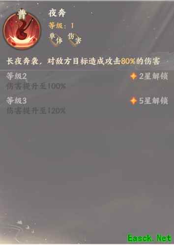 技能介绍: 一:夜奔 长夜奔袭,对敌方目标造成攻击80%的伤害
