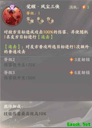 三:觉醒·风尘三侠 对敌方目标造成攻击100%的伤害,并使随机1名友方目标进行[追击] [追击] :对友方普攻所选目标进行1次额外的普通攻击