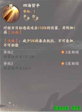 技能介绍: 一:四海皆平 对敌方目标造成攻击110%的伤害,并附加1层[汉魂] [汉魂] :减少5%的暴击抵抗,不可叠加,不可驱散