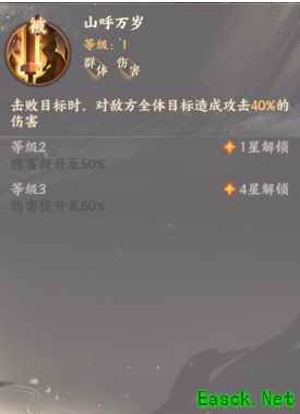 二:山呼万岁 击败目标时,对敌方全体目标造成攻击40%的伤害