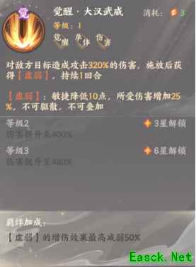 三:觉醒·大汉威武 对敌方目标造成攻击320%的伤害,施放后获得[虚弱].持续1回合 [虚弱 ] :敏捷降低10点, 所受伤害增加25%,不可驱散,不可叠加