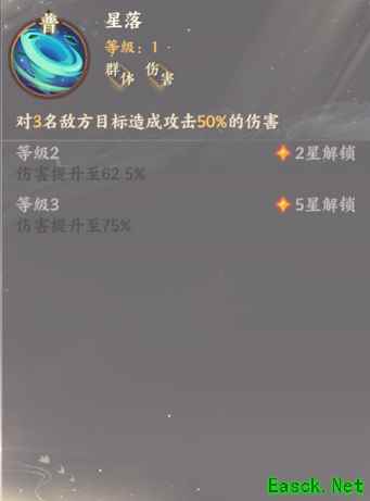 属性图鉴: 暂无 技能介绍: 一:星落 对3名敌方目标造成攻击50%的伤害