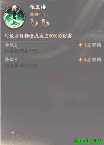 技能介绍: 一:坠玉楼 对敌方目标造成攻击60%的伤害