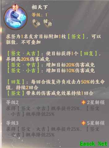 二:相天下 求签为1名友方目标附加1枚[签文 ] ,可以驱散,不可叠加 [签文,大吉]:使目标获得1个[回复],并提高20%伤害减免 [签文,中吉]:增加目标20%伤害减免 [签文,小吉]:增加目标10%伤害减免 [回复]:每回合恢复许负攻击力50%的生命值,持续2回合 [签文]带来的伤害减免效果持续1回合