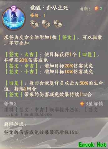 三:觉醒·卦尽生死 求签为友方全体附加1枚[签文] ,可以驱散,不可叠加 [签文,大吉]:使目标获得1个[回复],并提高20%伤害减免 [签文 ,中吉]: 增加目标20%伤害减免 [签文,小吉]:增加目标10%伤害减免 [回复]:每回合恢复许负攻击力50%的生命值,持续2回合 [签文]带来的伤害减免效果持续1回合