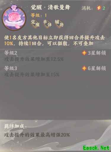 三:觉醒·清歌曼舞 使1名友方其他目标立即获得回合并提升攻击10%,持续1回合,可以驱散,不可叠加