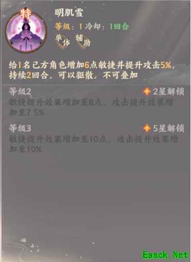 二:明肌雪 给1名己方角色增加6点敏捷并提升攻击5%,持续2回合,可以驱散,不可叠加