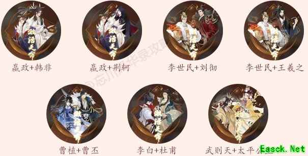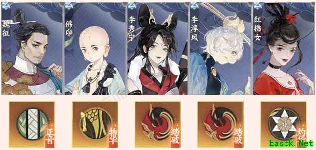 阵容详解: 该阵容以魏征、李秀宁、李淳风为主要输出,输出思路为魏征+红拂女的协战追击打爆发,李秀宁、李淳风进行常规输出,最后搭配一个佛印担当治疗位。 魏征:本阵容核心输出,队友普攻后会进行追击,极大程度地增加了队伍的输出。 替代性分析:目前无类似纯追击名士,不可替代。 红拂女:魏征优质挂件,赋予队友协战能力,协战会触发魏征的追击,两者形成联动,短回合内打出高额爆发。 替代性分析:目前无类似协战辅助型名士,不可替代。 李淳风:玄卡优质输出,大招可群可单,给队伍带来大量的输出收益。 替代性分析:纯群体输出。 上位替代推荐:王羲之、韩非、李世民、李白、嬴政 李秀宁:单体伤害极高,日常PVE中能快速压低BOSS血量,三个技能全部附带流血BUFF,与队伍中红拂女协战形成联动,非常强力! 替代性分析:纯单体输出 上位替代推荐:武则天、曹植 佛印:强力奶妈,集合群体减伤、群体治疗于一身,保证队伍生存力。 替代性分析:纯治疗担当 上位替代推荐:杨玉环、上官婉儿 上位替代后,可出现的天命组合·以魏征、红拂女、佛印为铁三角,可与以下天命组合结成阵容: