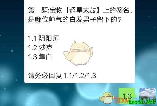 宝物[超星太鼓]上的签名,是哪位帅气的白发男子留下的1.1阴阳师 1.2沙克 1.3隼白 答题格式:直接回复1.1/1.2/1.3即可 正确答案:1.3