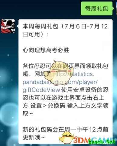 《忍者必须死3》7月6日每周礼包兑换码兑换码:心向理想高考必胜 领取时间:7月6日-7月12日