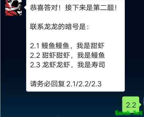 联系龙龙的暗号是(以下答案标红部分为正确答案) 2.1 鳗鱼鳗鱼,我是甜虾 2.2 甜虾甜虾,我是鳗鱼 2.3 龙虾龙虾,我是寿司