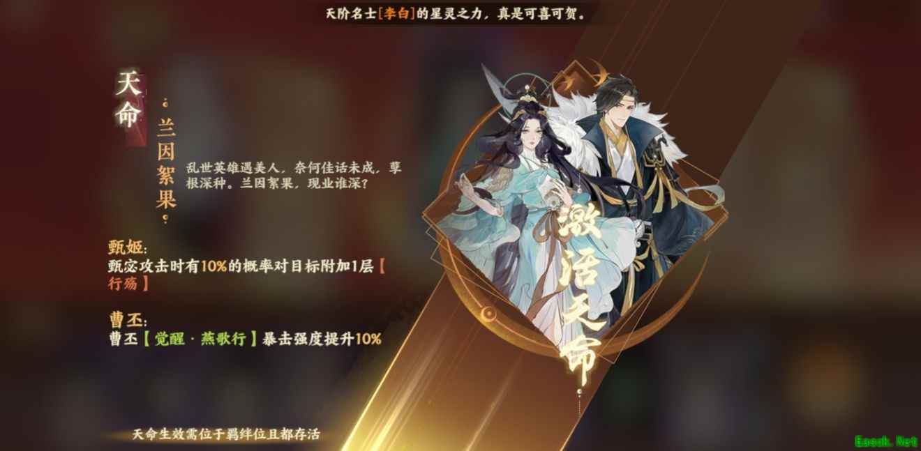 普通攻击——辞前尘 对敌方全体目标造成3次总计攻击54%的伤害 被动技能——灵蛇照影 战斗开始时获得2层【照影】,其中【照影】:每层提升攻击5%,不可驱散,最高可叠加2层。 觉醒技能——觉醒·浮生惊梦 对敌方全体目标造成3次总计攻击108%的伤害,消耗1层【照影】。不得不说,虽然甄姬是一个输出定位,但是大面积的群攻伤害,即使对面是“铁打的身子”,恐怕也遭不住甄姬的“致命一击”。 提起甄姬,不得不说的还有曹丕,在战场上,二人互相鼓气,为彼此激发天命技能,增强队伍的综合战斗力。其中,甄姬的天命技能为:甄姬攻击时有10%的概率对目标附加1层【行殇】,曹丕的天命技能为:曹丕【觉醒·燕歌行】暴击强度提升10%。