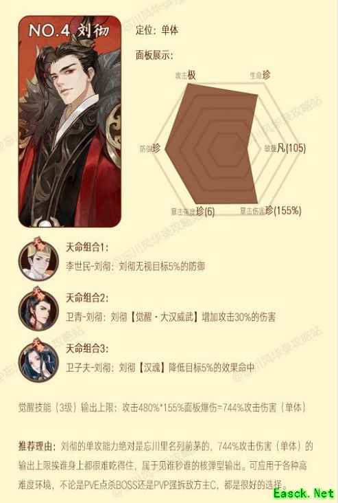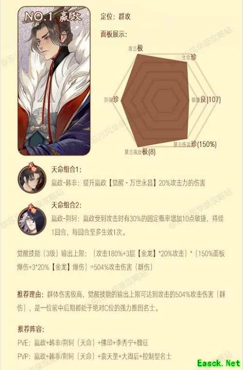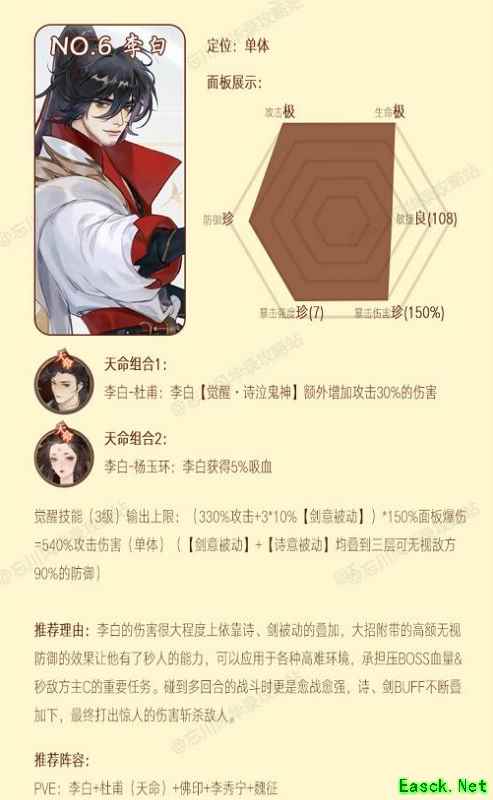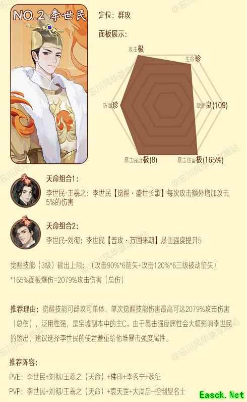 《忘川风华录》天卡选择推荐选择推荐: 1、每个角色都有自己的过人之处,建议大家根据自己的喜好来。 2、嬴政是非常帅的角色,但是不升星会刮痧,李白也是很洒脱; 3、如果要选实用度,推荐李世民,万金油角色,可单可群,伤害爆炸,非常好用。 开荒排行: